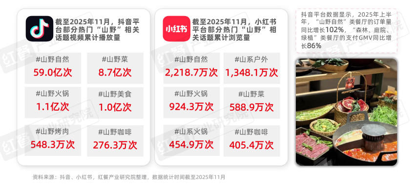 据红餐产业研究院发布的《山野餐饮研究报告2025》,2025年山野餐饮风潮持续升温,网络热度高居不下,正成为当下餐饮业的新风口。抖音平台上,截至2025年11月,“山野菜”“山野火锅”等话题的视频累计播放量已突破亿次。另据抖音数据,2025年上半年,“山野”类餐厅的订单量同比增长102%。