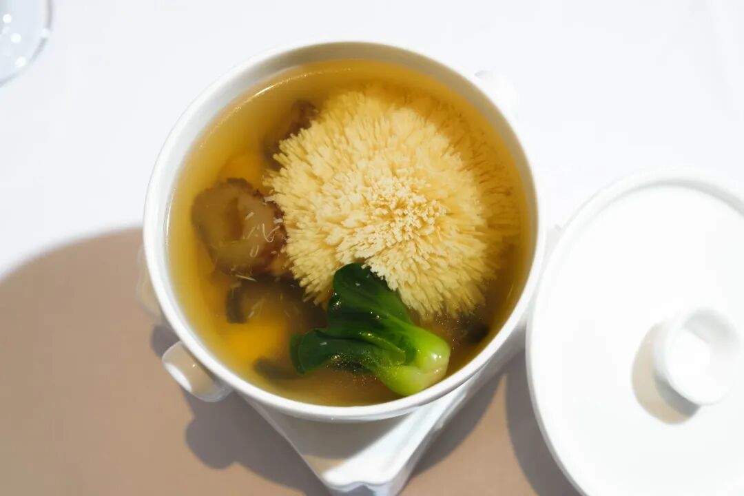 这道菜品以嫩豆腐为主料,运用淮扬菜的精细刀工,在豆腐上以悬刀法切出细丝并保持底部不断,形成绣球状;搭配海参、松茸等山珍海味,以粤式上汤炖制而成。成菜口感咸鲜,豆腐丝柔嫩顺滑,汤汁清澈温润。