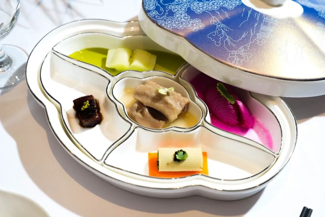 脱骨掌翼选用家禽掌翼部位,去骨后,以五香卤水慢煮入味,口感柔韧有嚼劲;蜜汁叉烧选取优质猪肉,外裹晶莹蜜汁,入口肉质嫩滑,酱汁香甜;爽口芥兰选用新鲜芥兰,处理后以泡椒汁拌匀,口感爽脆,酸辣开胃;鱼籽酱马兰则以清香爽口的马兰为主料,口感层次分明;樱桃小萝卜口感爽脆,酸甜适口,清新解腻。