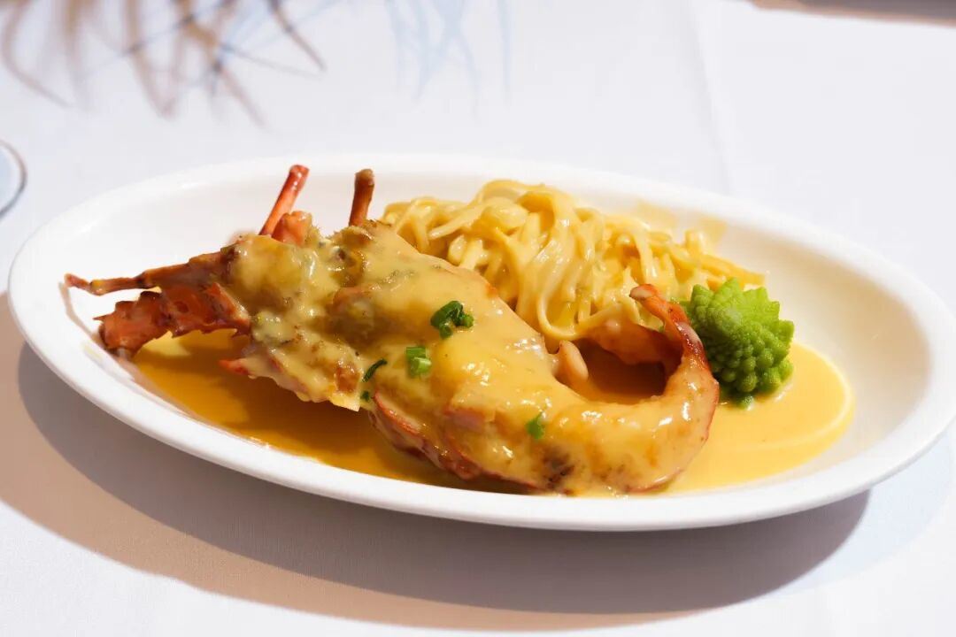 这道菜以鲜活青龙虾为主要食材,肉质饱满弹嫩。风范汁则采用黄油、洋葱、蒜末、淡奶油、白兰地与鱼露等多种食材调配而成,香气浓郁,与处理后的龙虾一同焗制,使酱汁风味渗入虾肉,成菜色泽亮艳,口味咸鲜,层次丰富。