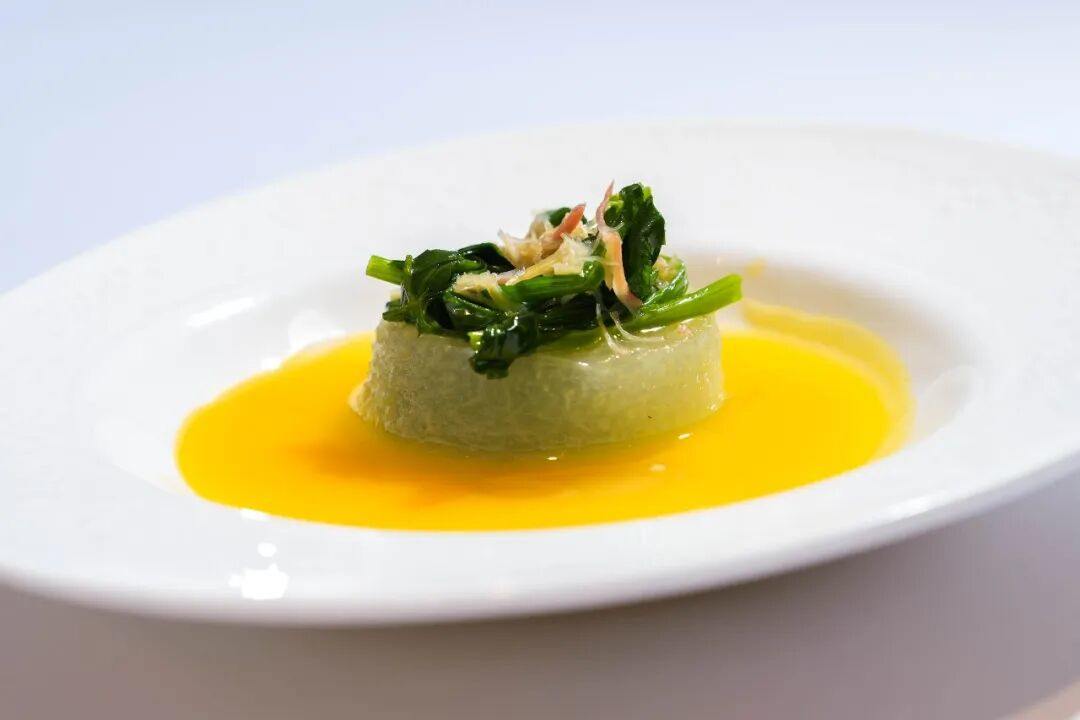 以鲜嫩豆苗为基底,加入金腿与瑶柱一同烹煮。火腿提供咸香底蕴,瑶柱赋予自然鲜甜,与豆苗的清甜相融。汤汁清澈而味醇,整体咸鲜温和,回味悠长。