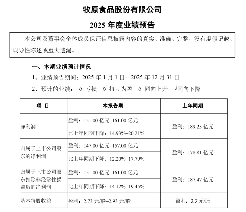 1月15日,牧原股份发布2025年度业绩预告,预计全年实现净利润147亿元-157亿元,比上年同期下降12.20%-17.79%,预计归属于上市公司股东扣除非经常性损益后的净利润151亿元-161亿元。