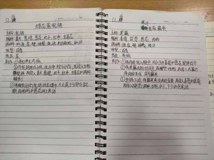白板上是今天教学的两道菜,虫草花蒸乳鸽和烧汁香煎藕夹。主料、辅料、调味料、味型、技法、制作步骤写得明明白白,甚至没有连笔字。在这里,甭管后厨实际的出餐效率有多高,课堂上的每道菜都要被掰碎了,花几个小时讲给学生听。
