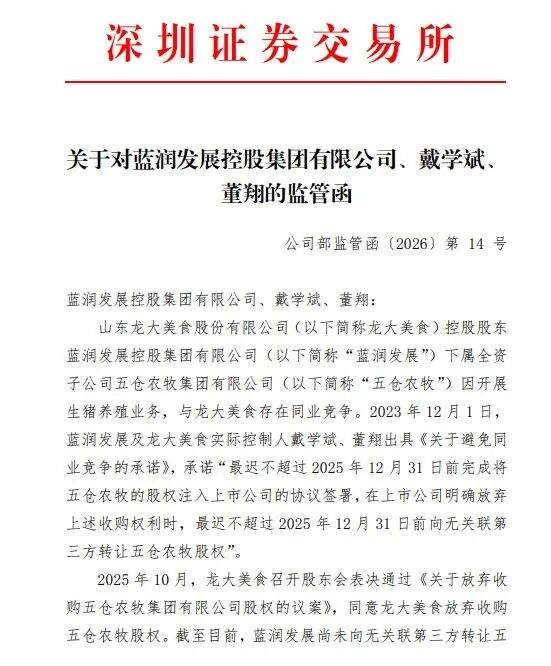 另外,除了被山东监管局要求整改,龙大美食还收到了深交所发出的《关于对蓝润发展控股集团有限公司、戴学斌、 董翔的监管函》。