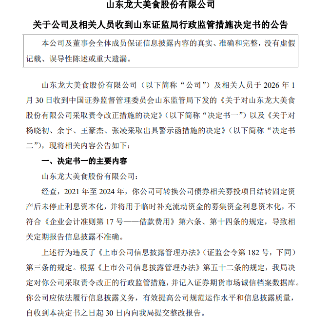 中国证券监督管理委员会山东监管局(下称“山东监管局”)下发的决定书显示,2021年至2024年,龙大美食可转债相关募投项目结转固定资产后未停止利息资本化,并将用于临时补充流动资金的募集资金利息资本化,不符合相关规定,导致相关定期报告信息披露不准确。