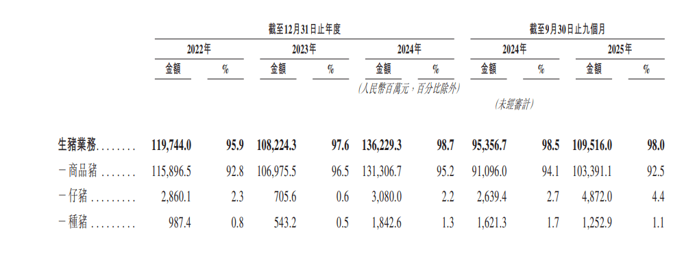 生猪业务是公司营收的绝对支柱,贡献超9成收入。招股书透露,2022年、2023年、2024年及2025年前9月,生猪业务收入(于分部间抵销前)分别为1197.44亿元、1082.24亿元、1362.29亿元、1095.16亿元,占总收入的95.9%、97.6%、98.7%、98.0%。