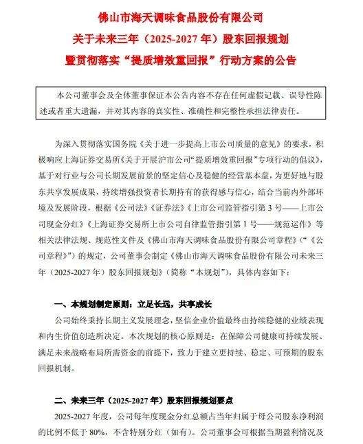 此外,海天还公布了未来分红规划,承诺在2025-2027年,每年度现金分红总额占当年归属于母公司股东净利润的比例不低于80%,不含特别分红(如有),彰显了公司回馈股东的长期意愿。