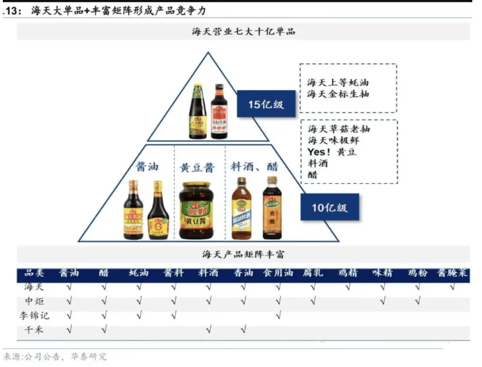 产品的广泛覆盖,又让海天味业脱离了“单一品类扩张”的掣肘,具备“全品类协同”优势。华泰研究的研报显示,海天有7个10亿级大单品,31个亿级单品,它们占销售收入的76.6%。
