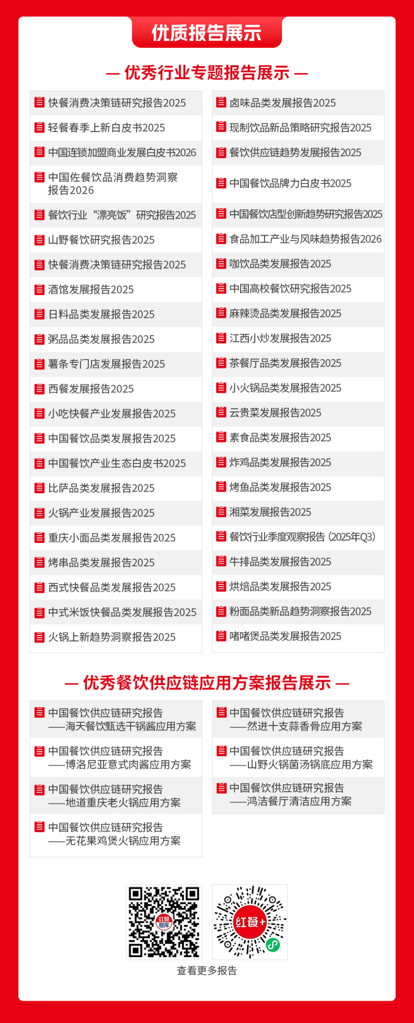 2026年,红餐产业研究院将计划发布100多份报告,持续为餐饮企业提供更及时、更系统的趋势研判与决策支持,欢迎大家持续关注。