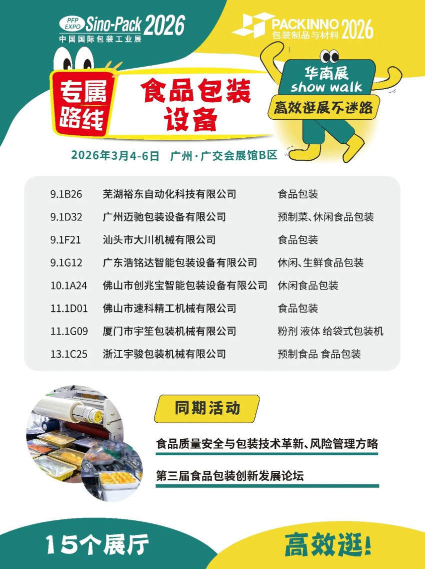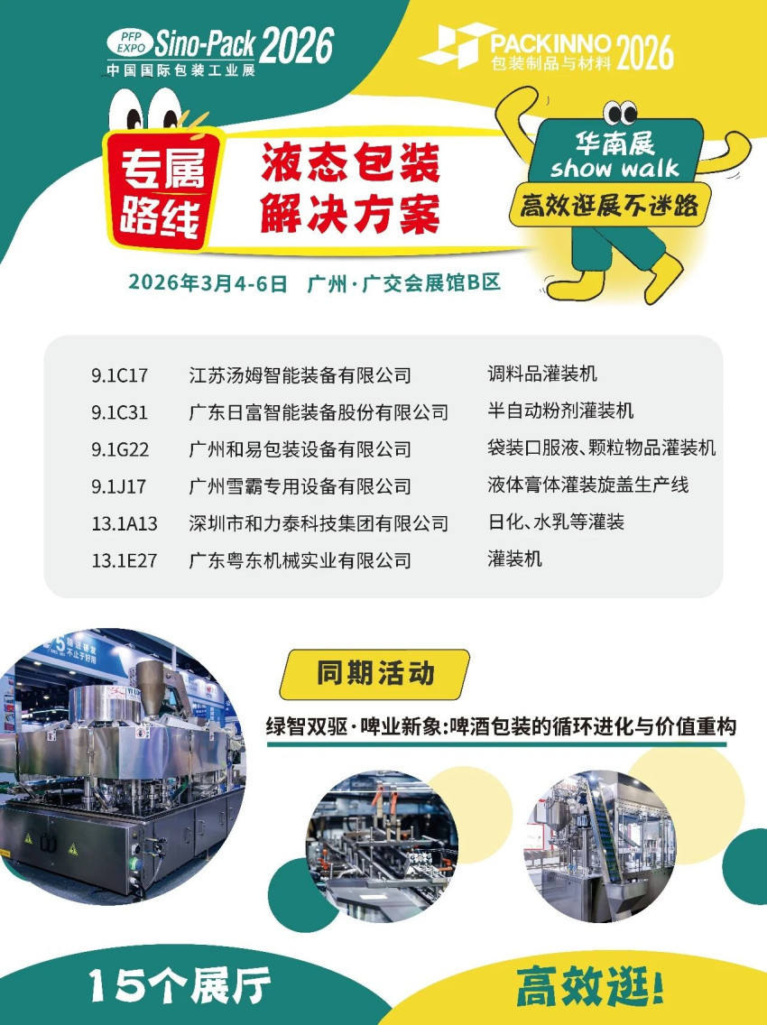 2026年,展会创新推出“华南包装展Show Walk”主题参观路线,规划高效食品饮料包装参观路径,直击未来包装趋势:
