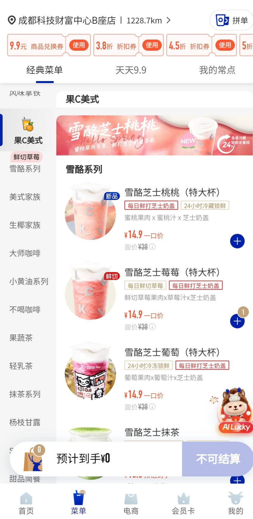 据红餐网了解,此次瑞幸推出的鲜切水果饮品均为城市限定,其中成都区域上线的雪酪芝士莓莓,主打门店每日新鲜现切草莓果肉,深圳区域推出的橙C美式、香柠茉莉美式、每日鲜柠茶、大果粒葡萄鲜柠茶四款饮品,则每杯标配两片现切柠檬片。价格方面,这几款城市限定饮品售价集中在9.9-14.9元之间,与新茶饮同类鲜果饮品相比,有一定性价比优势。