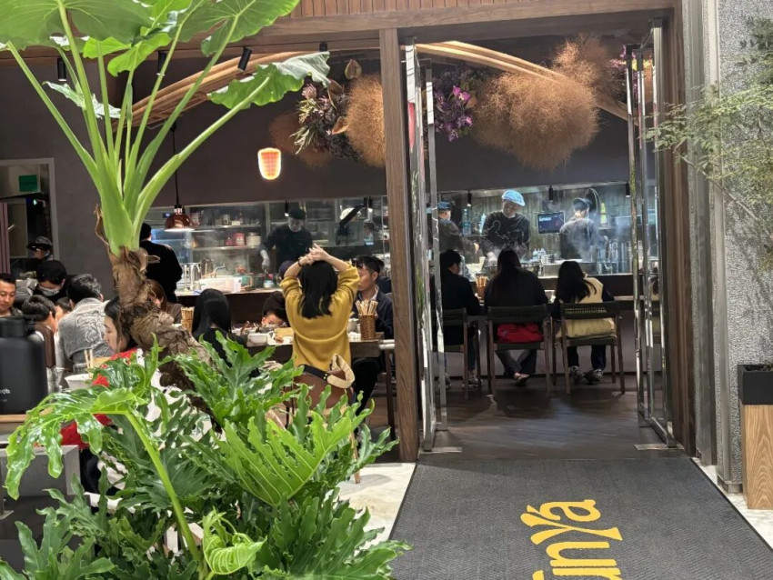 在大多数面馆,装修往往是最容易压缩成本的一环:简单桌椅、快速翻台、够用就行。但椿芽的第一家店,设计费用接近200万元。整个空间融合了木作、绿植、圆桌与现代感——不像面馆,更像一个可以慢慢坐下来的地方。