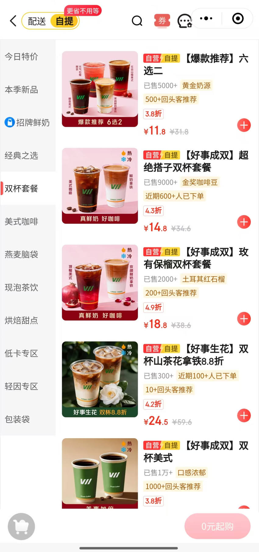 产品上,据门店点单小程序显示,其SKU超20款,包括饮品和烘焙产品,精准满足消费者多元化需求。具体来看,饮品线涵盖多款人气单品,既有海盐可可、醇香美式、红运山楂美式等爆款,也有茉莉拿铁、玫颜鲜奶拿铁、山茶花拿铁等招牌鲜奶系列,单杯价格在6.9-15.9元之间。为提升性价比,该店还推出了4款“好事生花”双杯套餐,售价集中在11.8-24.5元区间。烘焙产品则包括司康、菠萝包、雪媚娘等5款,售价为7.9-15.9元。