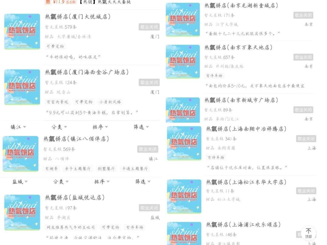 红餐网查阅官方小程序及社交平台信息还发现,热氣饼店在绍兴、无锡、镇江、厦门、漳州、建瓯等地均出现门店关门歇业情况。