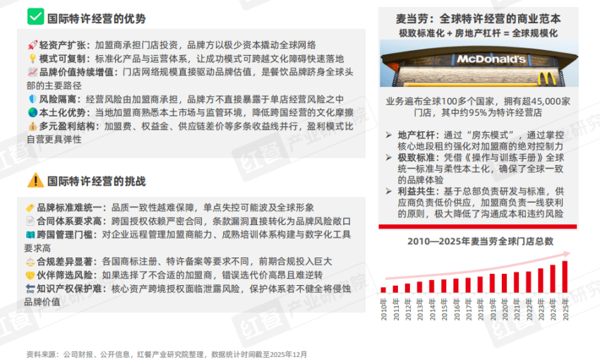 其中,国际特许经营是餐饮品牌实现全球化扩张的高效路径,品牌既能通过轻资产模式撬动全球网络、隔离单店风险,又能依托标准化体系与本土化伙伴快速落地,构建多元盈利结构。但品牌也需直面品质一致性难以保证、跨国管理门槛高、合规差异大等挑战。目前,全球市值TOP10的TOC餐饮企业中,均采用特许经营模式进行扩张。