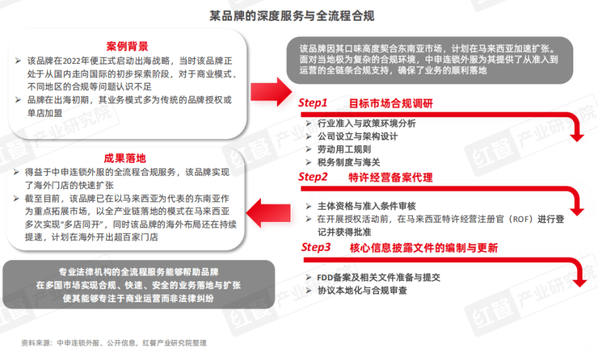 在确定目标市场后,依据目标国家的要求,进行品牌的合规备案是开展特许经营的前提。以某餐饮品牌为例,该品牌计划在合规流程最严格的国家之一的马来西亚进行扩张,面对当地复杂的政策环境,中申连锁外服为该品牌提供了全流程的合规服务,最终帮助该品牌在马来西亚实现快速、安全的业务落地与扩张。