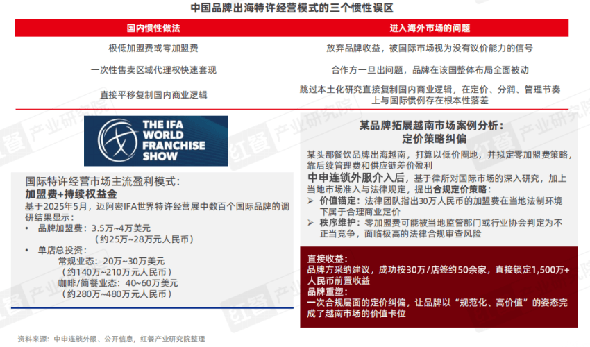 然而,出海不能粗暴复制国内打法,餐饮品牌需要重新构建国际特许经营规则。中国特许经营用近十年的时间走过了别国几十年的特许经营发展历程,已发展出丰富的盈利模式,但国际主流市场仍以传统加盟费和权益金体系为核心,两套逻辑之间存在根本性落差。