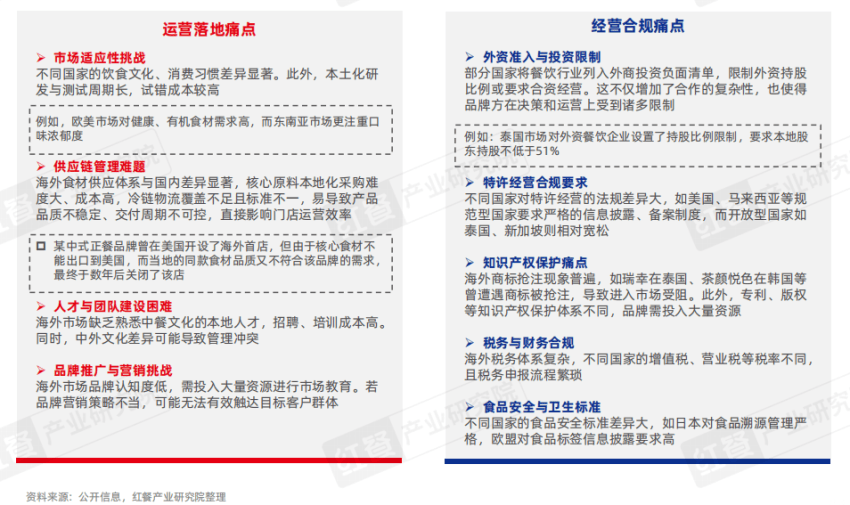 餐饮品牌在出海时面临着诸多痛点:运营落地层面,需应对市场适应、供应链管理、人才建设及推广营销等挑战。经营合规层面,则受限于投资准入、特许经营合规、知识产权保护、财税合规及食品安全标准等复杂要求。目前,还有许多品牌仍用产品出海而非体系出海的思维,无合规体系、无信息披露流程,这些将给品牌出海带来巨大的合规风险。