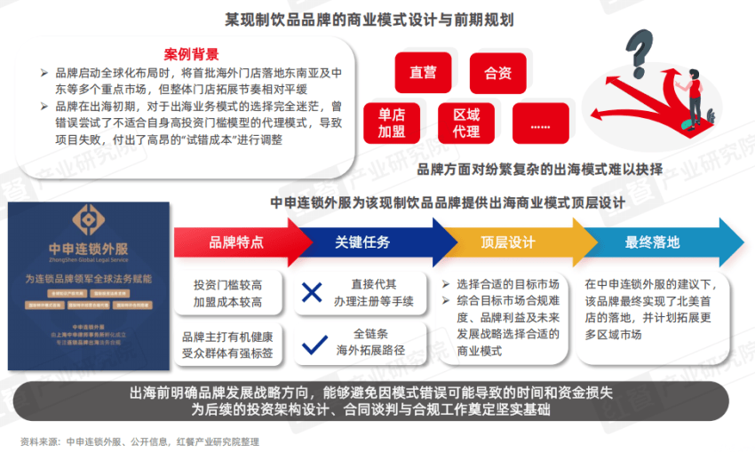 以某现制饮品品牌为例,该品牌在出海业务开展前期,因缺乏对自身品牌特性的清晰认知和合理的模式规划,导致了诸多困境和损失。在进一步拓展海外业务的过程中,中申连锁外服充分结合该品牌的特性,为该品牌进行了科学合理的顶层设计,最终帮助该品牌实现北美首店的落地,并为该品牌在后续的海外市场拓展计划提供了参考。