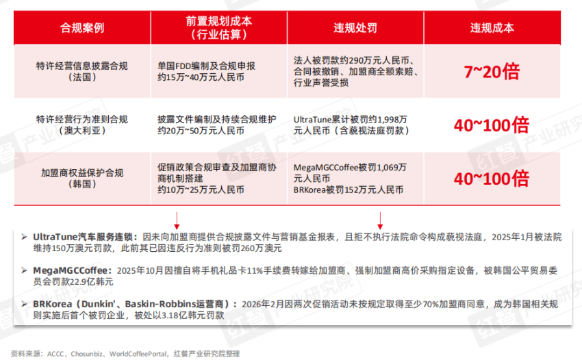 值得注意的是,特许经营合规的事后违规代价普遍达到前置法律规划投入的40~100倍,且该数值仅计直接罚款,未包含合同撤销、加盟费退还、经营损失及跨国诉讼等成本。此外,合规处罚记录在多数国家公开可查,一次违规将直接影响品牌声誉及后续市场拓展计划。前置法律规划不是成本项,而是出海体系建设中投资回报率最高的风控支出。
