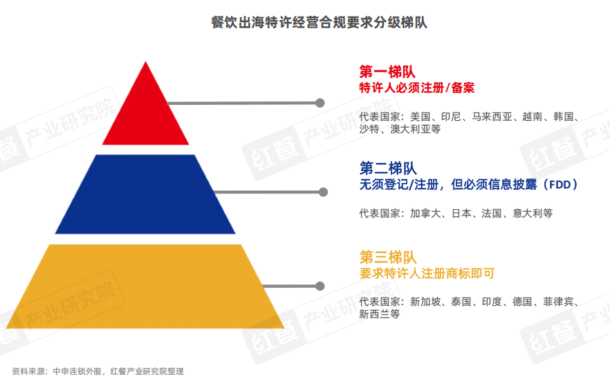 第一梯队要求特许人进行强制备案或登记,代表性国家包括美国、印度尼西亚、马来西亚等。第二梯队不要求特许人备案或登记,但需履行信息披露等义务,加拿大、日本、法国等属于这一梯队。第三梯队仅需满足商标持有等基础合规条件,新加坡、泰国、印度等为主要代表国家。