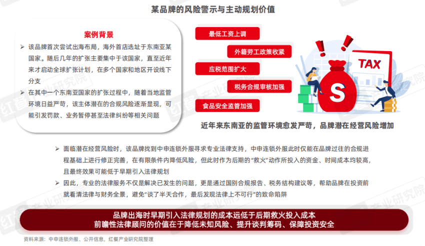 因而,品牌启动出海战略时,提前寻求专业法律机构引入法律规划十分必要。以某餐饮品牌为例,其在东南亚某国的运营过程中发现当地监管环境变化,品牌潜在的合规风险被激活,因此找到中申连锁外服寻求专业法律帮助进行补救,但此时投入成本相对较高。建议品牌在出海初期尽早完成相关法律规划,降低未知风险。