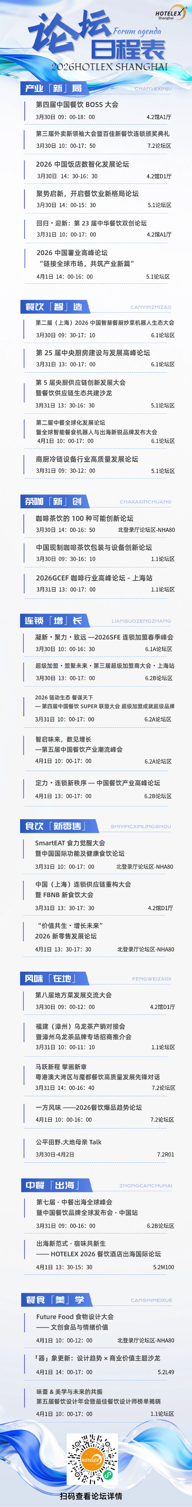 而接下来三天,还有回归·迎新:第23届中华餐饮双创论坛、第25届中央厨房建设与发展高峰论坛、第5届央厨供应链创新发展大会暨餐饮供应链生态共建沙龙、2026GCEF咖啡行业高峰论坛-上海站等更多主题论坛、大会将同期召开。