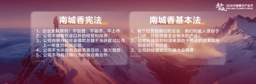 我今天的主题是《践行“长期主义”经营哲学,穿越周期》。大家要把握经济周期,不要瞎忙。2024年、2025年,南城香都没怎么开店,2026年也还在观望。这个时候,瞎忙开店的几乎没有挣钱的,我们要知道什么时候该干什么事情,不该干什么事情。