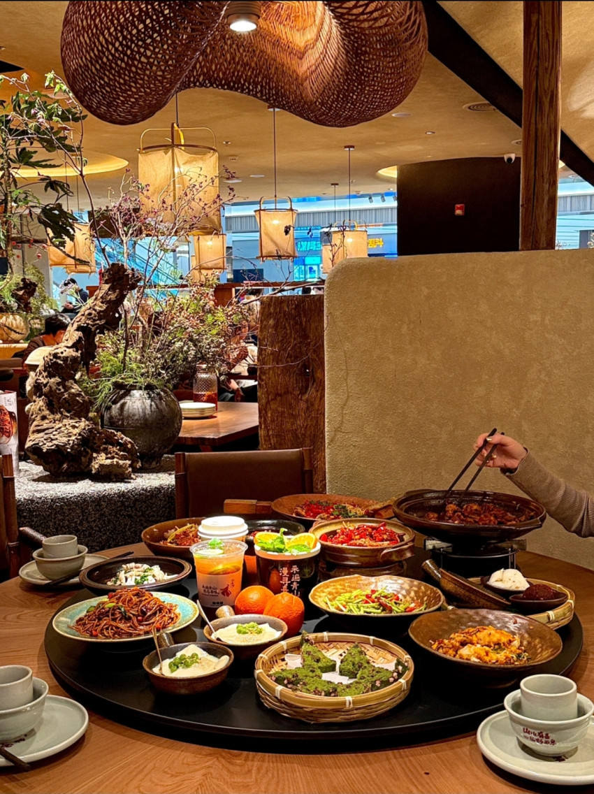 另一个走“山野风+漂亮饭”特色路线的代表则是杨有喜·山野江西菜。该品牌在食材上选用野菜、菌菇、竹笋等江西山野物产,做法上同样以猛火现炒,强调锅气和菜品的鲜辣口感。为了打造沉浸式山野风用餐氛围,该品牌还将竹编、青砖、瓦罐等装饰元素融入门店空间中,凭借鲜明的风格特色在社交平台上保持着极高的热度。