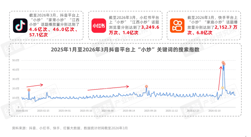 在线下门店快速增长的同时,在线上,中式小炒热度同样居高不下。红餐大数据显示,截至目前,抖音平台上“家常小炒”“小炒”“江西小炒”等话题播放量分别达到了4.6亿次.、46.0亿次和57.1亿次;小红书平台上与小炒相关的话题浏览量接近1.5亿次;快手平台上“小炒”“家庭小炒”话题播放量责分别达到了2,152.7万次和6.8亿次。