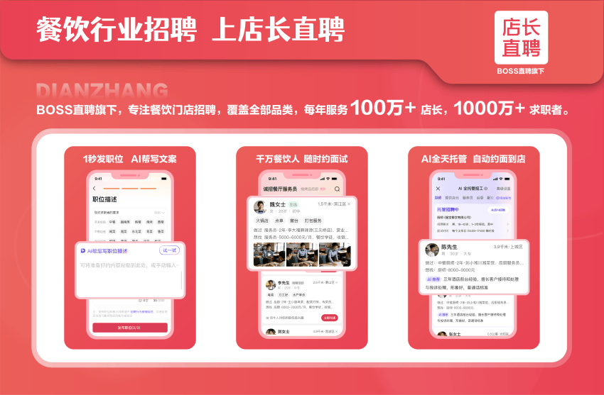 店长直聘是BOSS直聘旗下,专注餐饮门店招聘的平台,累计服务4000万用户。我们致力于用更精准的推荐、更便捷的操作和更强大的AI辅助,帮助门店招聘更加高效与智能!