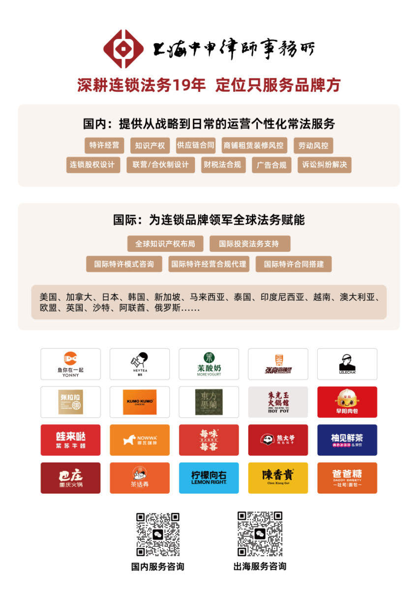 上海中申律师事务所成立于2007年,是国内极少数专注服务连锁品牌方的专业法律机构,深耕连锁法务19年,正在为鱼你在一起、早阳肉包、挪瓦咖啡等200+连锁品牌提供专业法律支持,致力于成为世界级连锁法务第一品牌。