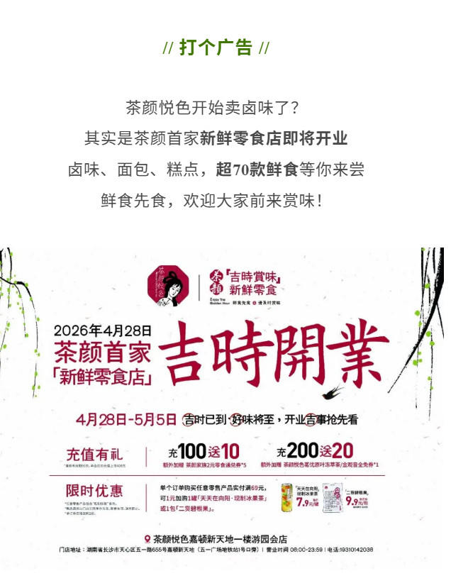 值得关注的是,茶颜悦色这家提供卤味熟食产品的新鲜零食店,位于其长沙天心区嘉顿新天地一楼游园会店内,是以类似“店中店”的形式开出,具体的开业时间为4月28日。据了解,新鲜零食店的卤味专区开业后将与嘉顿新天地店现有的茶颜悦色奶茶、古德墨柠、昼夜诗酒茶区域同步营业,可为消费者提供“饮品+卤味”的一站式消费体验。