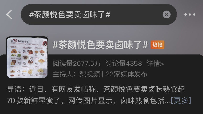 近期,有网友在社交平台发帖称,茶颜悦色将要在门店跨界卖卤味熟食产品。这一消息迅速引发大众关注,相关话题“茶颜悦色要卖卤味了”甚至还登上微博热搜,阅读量累计超2000万,让不少网友直呼“惊喜拉满”。