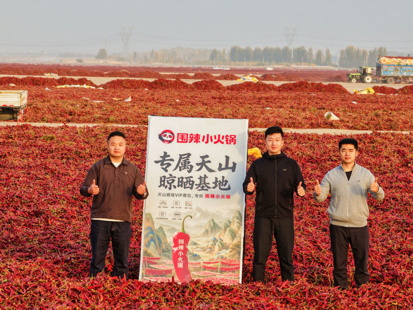 围辣小火锅3位创始人在新疆辣椒晒场合影▲