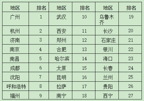 表 2:27 个省会城市餐饮产业竞争力综合得分排序表