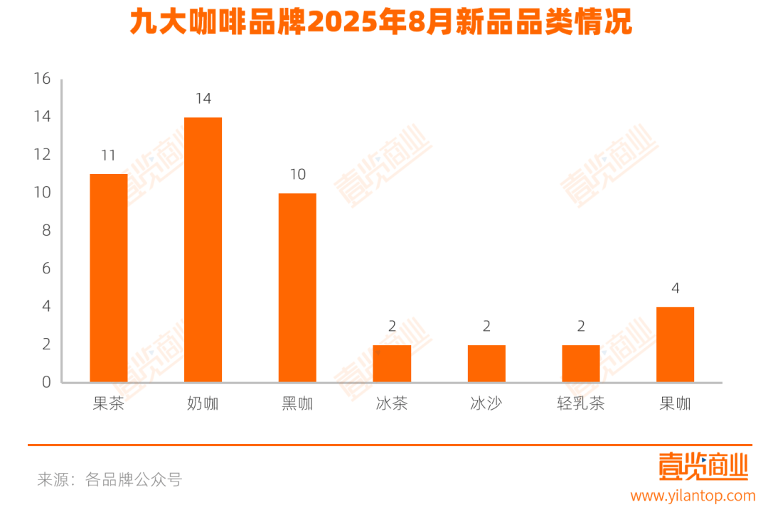据茶咖观察统计,今年8月,全国门店数量TOP10的咖啡品牌共推出了46款新品,平均每日上新1.5款产品。