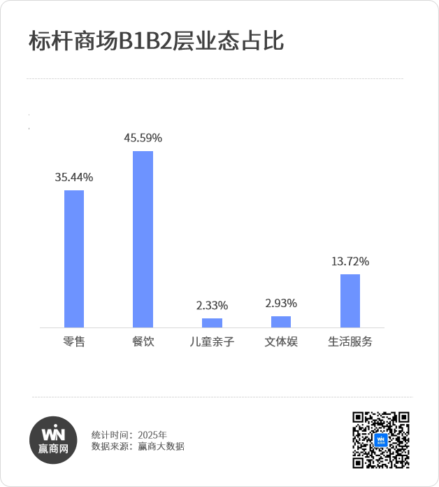 据赢商大数据监测,近三年,26城600+标杆商场B1B2层五大业态(零售/餐饮/儿童亲子/文体娱/生活服务)占比波动不大,餐饮占比约45%,零售占比约35%。