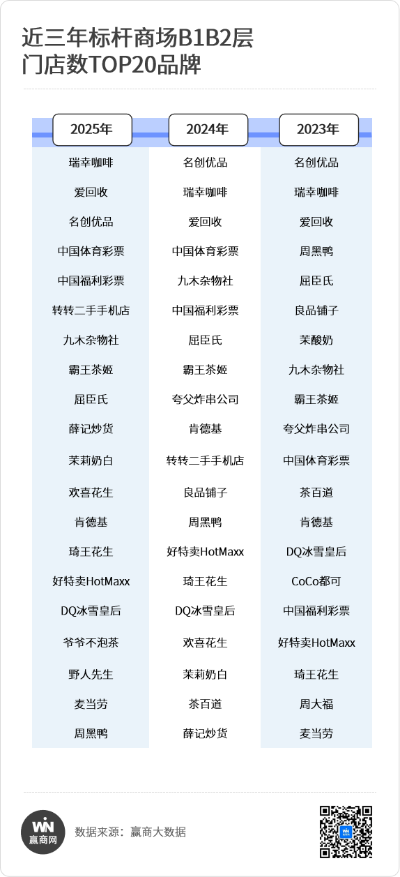 瑞幸咖啡、名创优品、肯德基、九木杂物社、霸王茶姬、爱回收、DQ冰雪皇后、琦王花生、中国体育彩票、中国福利彩票等品牌,凭借高性价比、强品牌力、高承租力等,连续三年稳居B1B2层门店规模TOP20品牌,堪称“B1B2层中流砥柱”,构成了稳定、可靠的流量基本盘,它们是招商安全牌。