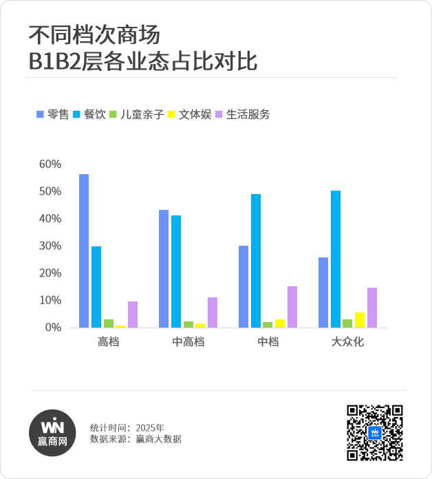 越是高档商场,零售占比越高;越是亲民的商场,餐饮、生活服务占比越高。