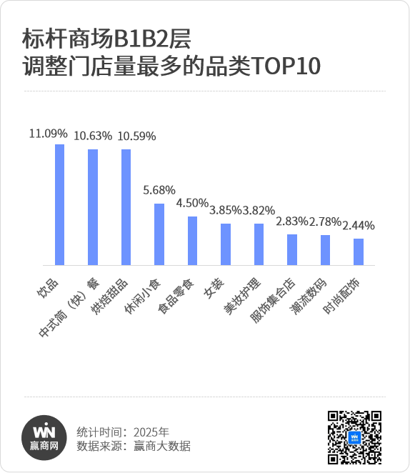 而在中档/大众化商场,B1B2层则承担起“流量发动机”的使命。这里的业态组合呈现出截然不同的面貌——为小而美、轻量化餐饮的绝对主场。中式简(快)餐占比遥遥领先,在13%以上,且TOP10品类几乎都是餐饮细分品类。