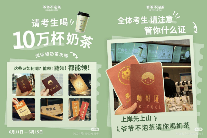 高考季,爷爷不泡茶化身“解压搭子”。今年高考期间,爷爷不泡茶推出“10万杯奶茶送考生”活动,消费者可以凭“证”领“空山栀子”。