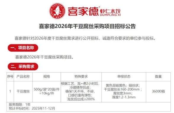近日,“喜家德采购招标平台”公众号发文称,喜家德针对2026年度干豆腐丝需求进行公开招标,诚邀符合要求的单位参与投标。