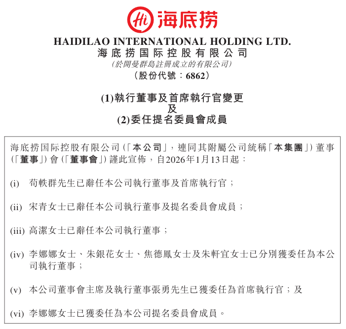 在董事会成员调整的同时,海底捞亦完成新一轮执行董事委任。公告称,为支持本公司持续创新及长期发展,积极磨砺并培养年轻一代管理团队,李娜娜、朱银花、焦德凤及朱轩宜已分别获委任为公司执行董事,其中,李娜娜还获委任为公司提名委员会成员。