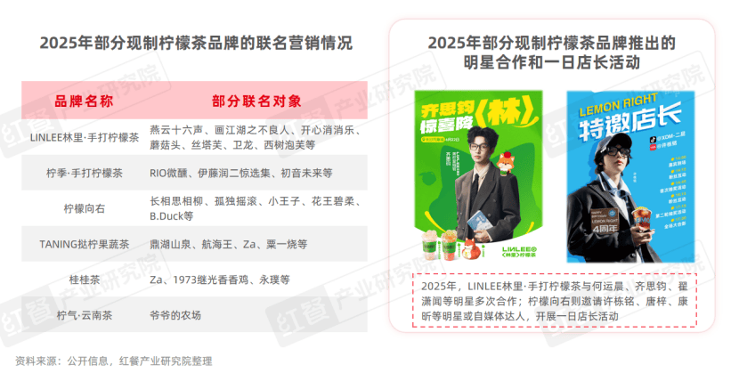 例如,2025年,LINLEE林里·手打柠檬茶、柠季·手打柠檬茶、柠檬向右、TANING挞柠果蔬茶、桂桂茶等品牌分别与知名品牌、动漫IP、游戏IP等展开了多次联名合作。此外,LINLEE林里·手打柠檬茶、柠檬向右、快乐柠檬、阿爆柠檬茶等品牌还通过一日店长活动或明星合作,进一步拉近与消费者的距离。