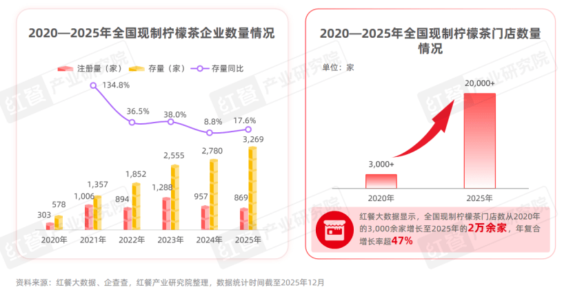 企查查数据显示,从2021年开始,每年现制柠檬茶相关企业注册量稳定在1,000家左右,截至2025年12月,全国现制柠檬茶企业已有3,200余家。红餐大数据显示,全国现制柠檬茶门店数从2020年的3,000余家增长至2025年的2万余家,增长了约7倍,年复合增长率超过47%。