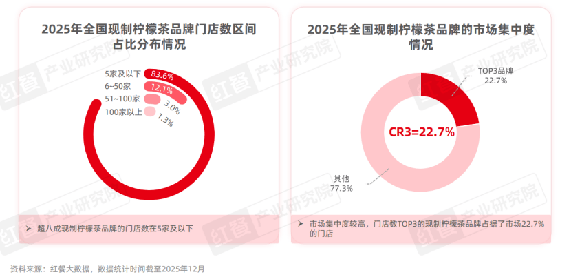 现制柠檬茶品类的连锁化程度较高,目前市场上超过50%的现制柠檬茶门店均是连锁品牌门店。与此同时,现制柠檬茶品类的市场集中度也较高。截至2025年12月,门店数前三的现制柠檬茶品牌占据了市场22.7%的门店。