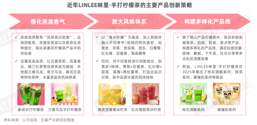 红餐产业研究院分析发现,LINLEE林里·手打柠檬茶的产品创新策略主要围绕“强化茶底香气—放大风味体系—构建多样化产品线”展开。比如,在茶底选择上,其运用拼配茶、浓香型茶底以及差异化茶种组合,强化茶香在柠檬茶产品中的存在感。在配料上,其深入挖掘并融入不同季节/地域的特色食材,同时对不同食材进行创新组合,打造出层次分明的风味体验。此外,其还积极拓展果茶、奶茶、轻食、甜点等产品,满足消费者多元化的消费场景。