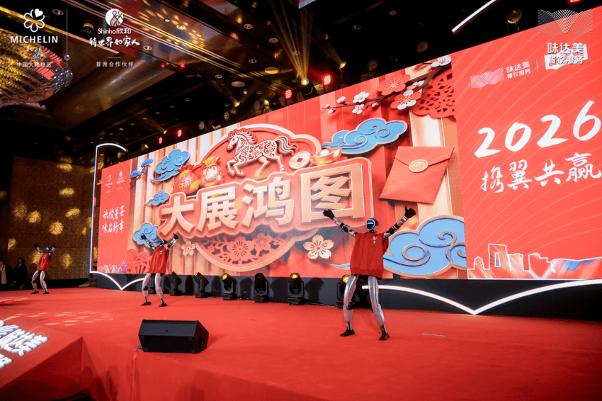 机器人帮助嘉宾完成签到,动感十足的机器人舞蹈,AI一键生成专属的新春祝福海报……这些科技元素的植入,并非噱头,而是在提示:专业的传承与前沿的技术可以并行不悖,共同塑造当代的餐饮体验。