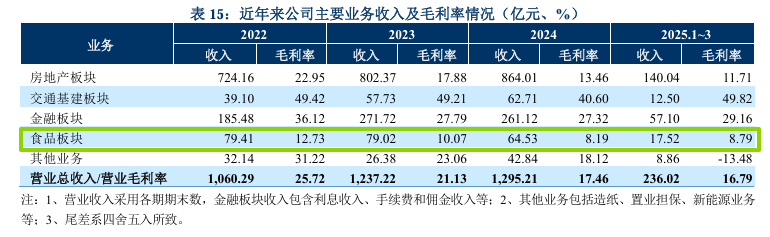 到了2024年,食品板块收入降至64.53亿元,营收占比不足5%。其中乳业32.42亿元,生猪养殖10.25亿元,生鲜9.85亿元,食品深加工12.01亿元,整体毛利率跌到了8开头。2025年大概率延续这一走低态势,前三季度营收50.77亿元。